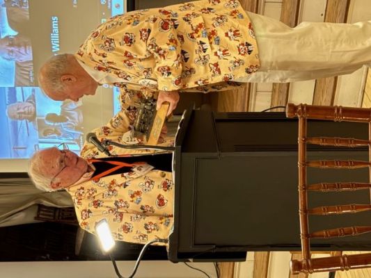 The awards and citations are listed below, most recent first. November 18, 2022. Bill "Roller" Leahy . The dinner event, MC'd by Steve Harwood, was preceded by Tiger Talk, "Aging Gracefully", which Bill presented jointly with Barbara Goltz (click here for the Tiger Talk video). The citation for Bill's award is: "We’re honoring Bill (Roller) Leahy for his outstanding work as Board member and President of Alumni Corp., which promotes non-profits in various ways; his contribution in starting a program to encourage non-college bound high school juniors and seniors to pursue nursing; his contributions as a Class vice president, notably starting the Locomotive Award program; and his professional contributions in the field of neurology." For much more about Bill's extensive contributions, click here for Glenn Goltz's introductory remarks. The photo shows Bill accepting the award from Glenn Goltz. For more photos from the dinner and award ceremony, please see the "Classmate Sightings" page and scroll down to November 18.
