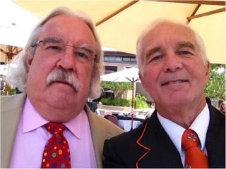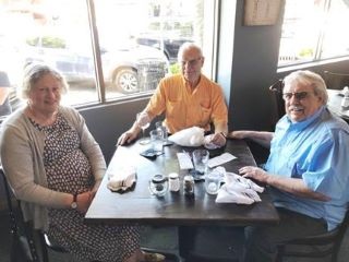 On the left, Larry is with Tom Scott (d) in 2014 at Dick Fitzpatrick's memorial service. On the right are Alice Miller, Rick Bowers, and Larry in 2018 at Stanford. |