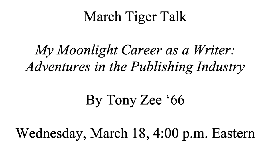 His Tiger Talk will focus on his writing career, which has been prolific. He hopes that the talk will be helpful to some classmates. Tony promises that there will be no physics quiz afterward and a minimal number of complex scientific terms.