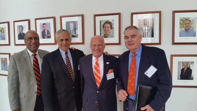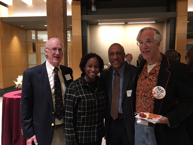 April 30, 2016. Owen Mathieu, Bud D'Avela, Henry Von Kohorn, and Jim Parmentier are pictured at the Woodrow Wilson School attending the annual Princeton Prize Symposium.