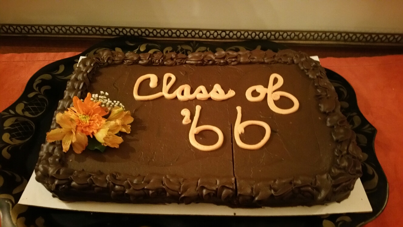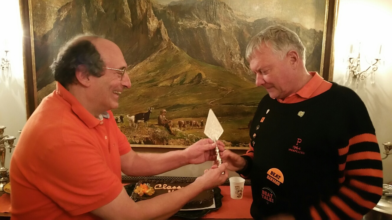 October 22, 2016. Plohn Hall was full of '66'ers and their guests, bringing the home coming weekend to a close. The photos show the peaceful transition of presidential power (a class tradition symbolized by passing the cake slicer and furling the old presidential flag), followed by letting us all eat cake and enjoy a Tigertones serenade (click here and here).