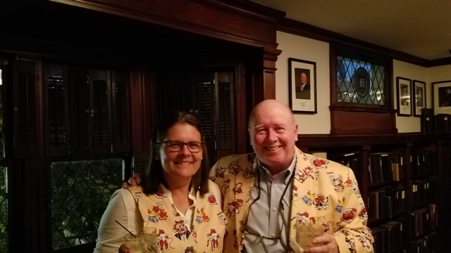 November 12, 2016. From David Lee: Hallie and I drove to New Haven over the weekend to the Princeton Yale game, and watched the Tigers spank Yale 31-3 in a very satisfying, dominating win. We have done this a couple of times because we have a group of Princeton and Yale CT friends who organize a tailgate and then after the game we all have dinner together at Mory's in downtown New Haven. So there were 19 of us in the Library Room at Mory's and Hallie and I wore our Reunion outfits. As we came through the door at Mory's the two staffers there got very excited when they saw our Reunion gear and exclaimed, "You guys look so cute we can't stand it", and "these are the most amazing outfits we've ever seen". We went up to the Library room for dinner and the staff up there kind of went bananas. One guy exclaimed " You guys are amazing! You have made my day!" Another Mory's staffer said, " I've never seen anything like this! Go Princeton!" When our Yale friends arrived, we received numerous additional compliments. Finally, on the way out of Mory's some guy got up from his table downstairs and said, "That is the most amazing jacket I've ever seen".