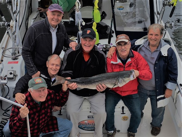 April 27, 2017. Here's the Princeton class of 1966 D.C. lunch group. Annual Chesapeake Bay trophy striped bass fishing trip, April 2017. L-R: Peter Cary (kneeling), John Slidell (kneeling), Frank Nuessle (standing), Walt Smedley (seated), Wallace Judd (seated), Nelson Hendler (standing), striped bass, in repose.