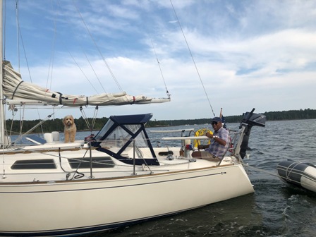 August 28, 2018. Jim Parmentier is sailing in Maine and meeting up with other classmates. "Susan Gabert and I hosted Eileen and Owen Mathieu overnight this past Saturday as they made their way from Marblehead to Penobscot Bay on their 30' Sabre NORBECK....and we fed Barbara and Glenn Goltz a drive-by dinner on Sunday evening as they headed to Camden to sail the schooner GRACE BAILEY for a week. Susan is the lady to Glenn's right in the picture. Lynn and David Williams introduced us last Fall, after our Chesapeake mini-reunion."