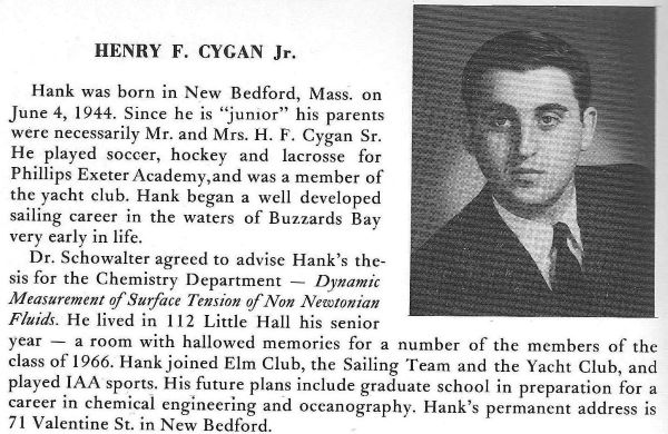 Peter L. Wilson: Hank and I sailed together on the Princeton Varsity team. He was a great crew and we had many exciting fall and early spring weekends freezing our butts off instead of partying on campus; memorably at MIT/Harvard on the Charles River, at the Merchant Marine Academy in Great Neck, L.I., and down in Annapolis at the Naval Academy. He was a 'big boat' sailor and I was a small one-design sailor. In 1965 he along with other 'big boat' sailors Bill Torgerson, Bob Purrington, and others were instrumental in helping Princeton beat Navy in the MacMillan Cup which was sailed in the (even then old) Luders 44 yawls. We were one of the only crews, other than Navy, who could handle the spinnaker safely in 18-20+ knots of breeze. Sail on in peaceful waters Hank.