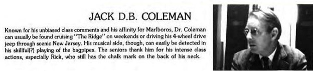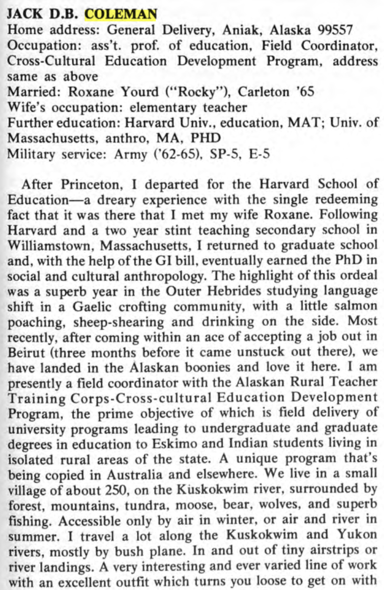Jack graduated from the South Kent School in 1956, entered Princeton in 1956, and spent much of his later career in education. His 10th Reunion Book essay shows him living and teaching in Aniak, Alaska. The following photos trace his career as a teacher at the William Penn Charter School in Philadelphia. We are in contact with Jack's family and expect to receive additional information, memories, and photos soon.