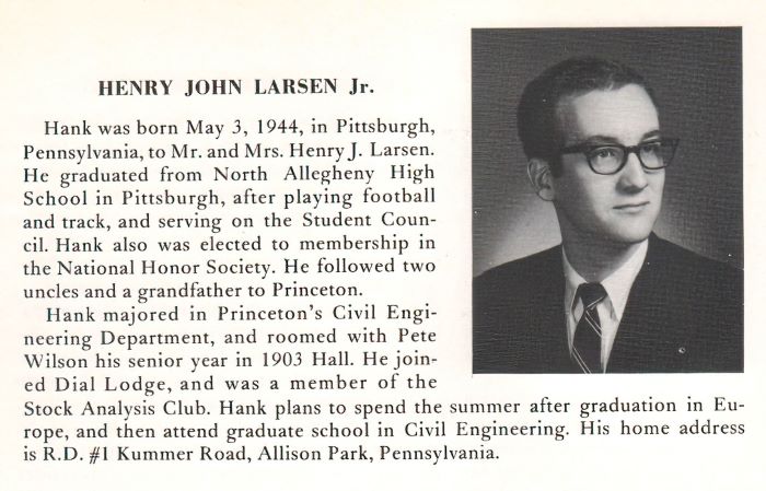 A resident of Mill Valley, CA, Henry came to Princeton from Allison Park, PA and attended North Allegheny HS. At Princeton, he majored in Civil Engineering and was a member of Dial Lodge. He roomed with Peter A. Wilson.