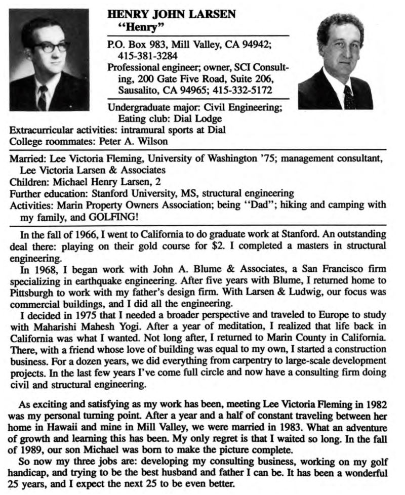 After Princeton, Henry moved to Stanford and earned an MS degree in structural engineering. Following graduation, he specialized in earthquake engineering in the Bay Area, then moved back to Pittsburgh to work with his father's company, and in 1991 was back in the Bay Area leading his own company, Larsen Engineering.
