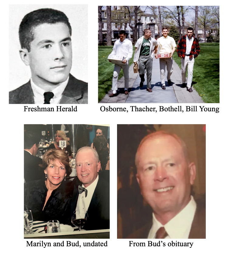 Old memories can be tough to “dig” up……..I first met Bud very early freshman year – he was this perpetually happy person from Chicago who lived in Pyne. A small group of us participated in the freshman/sophomore shenanigans leading up to the cane-spree match. He was just a really good all-around guy, fun to be around. When he smiled, which was almost all the time, his whole face would light up. We became very good friends. Sophomore year, a whole bunch of us roomed together in Henry – my feeble mind indicates that the group included: Thacher, Lumpkin, Hodge, Cruikshank, Al Smith, Hurtubise, Osborne, Wolcott, & Cooper…..we had three suites, one for partying (including a classic toga party!) and two for living – it was a fun time leading up to Bicker, when it sort of broke down along club lines. Bud and I joined Cannon together and thoroughly enjoyed our spring semester.