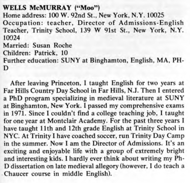 At the time of his death, Wells lived in Santa Fe, NM and was retired from a career of over 40 years as a college counselor director, coach, and teacher. At the time of our 10th reunion, he was Director of Admissions at Trinity School in New York and at the 25th reunion, Wells was Director of College Counseling at Greenhill School in Addisson, TX near Dallas.