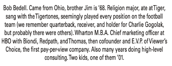 The October 12, 1965 Daily Princetonian article, The Tiger Quaterback: Jack of All Trades, features Bob, describes his duties, and has numerous action photos. Start on page 8 and continue on page 6. In the process, it'll be hard to resist reading other Princeton news from 1965.